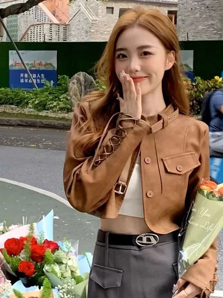 Vintage Brown Leather Jacket Women Spring Autumn Y2K Tassel Drawstring Design Outwear Japanese Retro Short Cardigan Lady Tops