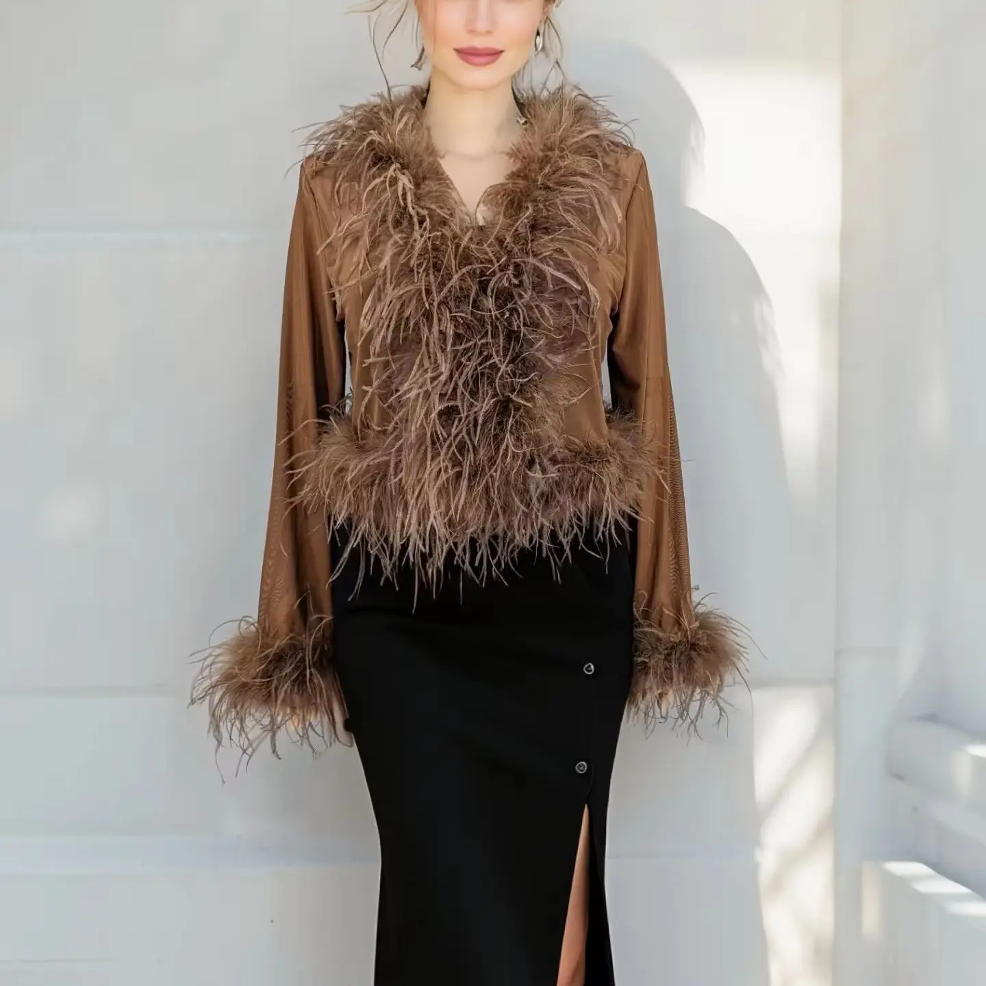 women See-through top with real ostrich feather brown black cropped jacket top bolero