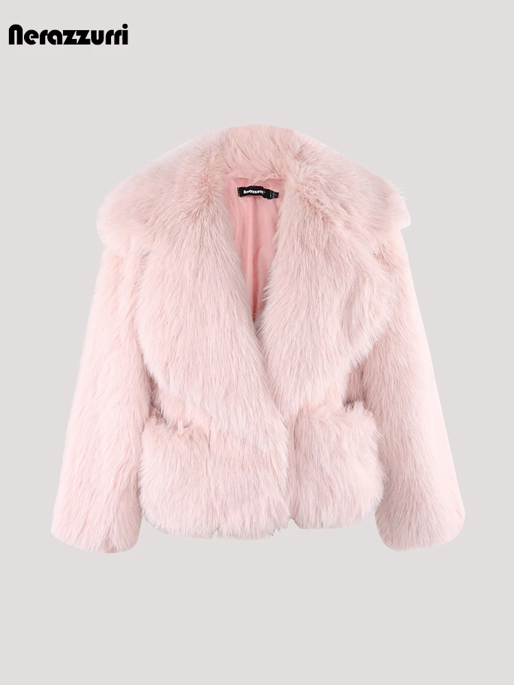 Nerazzurri Winter Short Loose Casual Hairy Soft Thick Warm Pink Faux Fur Coat Women with Big Collar and Pockets Fluffy Jacket  Read more