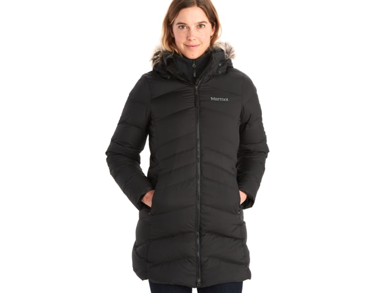 Marmot Montreaux Coat - Women's Black Small 195115264314. Durably water-resistant Ripstop fabric sheds weather while 700 fill goose down corrals heat for a civilized interior even in wild winter conditions. The down filled hood features a removable...  Read more