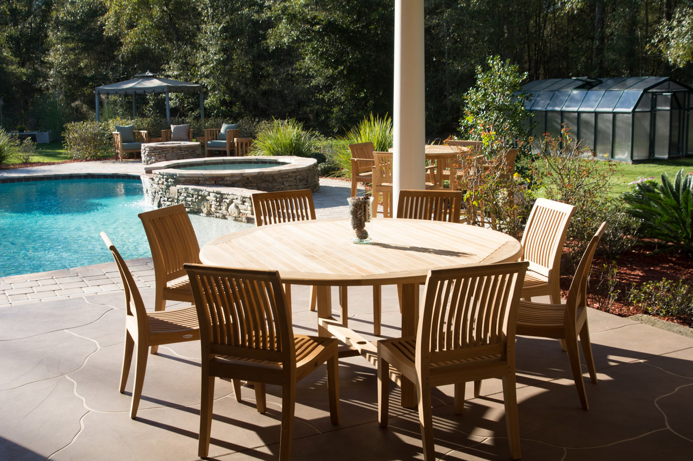 "Impressive 6ft Round Buckingham Teak Patio Table combined with 8 Laguna Teak Side Chairs creates the ultimate in luxury outdoor furniture. Crafted with 100% Grade A Teak harvested from sustainable plantations in Indonesia."  Read more