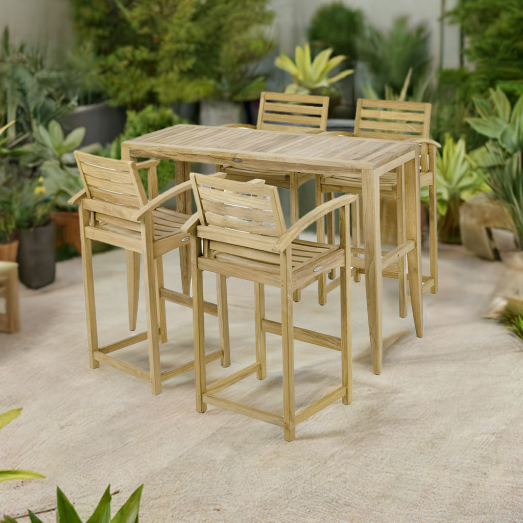"5pc Premium Somerset Teak Wood Bar Table set built to last a lifetime. Includes 4 Bar Stools and 1 Rectangular Laguna Teak Bar Table. Built to Commercial standards. Lifetime Teak Warranty. Quality Rated Best Overall by Wall Street Journal."  Read more