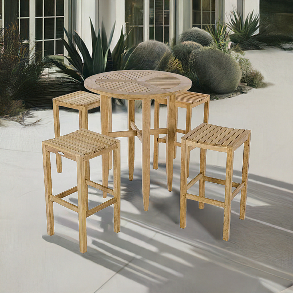 "5pc Somerset Laguna Teak Bar Set made of premium grade 'A' teak wood. Includes 4 barstools and 1 round bar table. All weather construction. Indoor or Outdoor use. Lifetime Warranty. Optional cushions available in 95 colors."  Read more