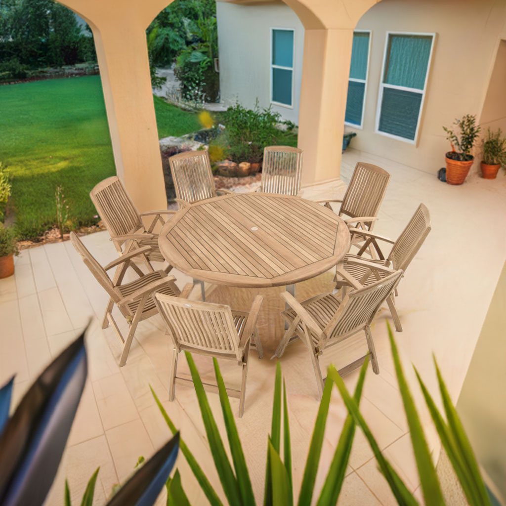 "Vogue 9 pc Round Dining Set. Includes 6 ft Round Vogue Teak and Stainless Steel Table and 8 Barbuda Reclining Chairs. Built with 100% Grade A Teak harvested from sustainable plantations in Indonesia and premium stainless steel."  Read more