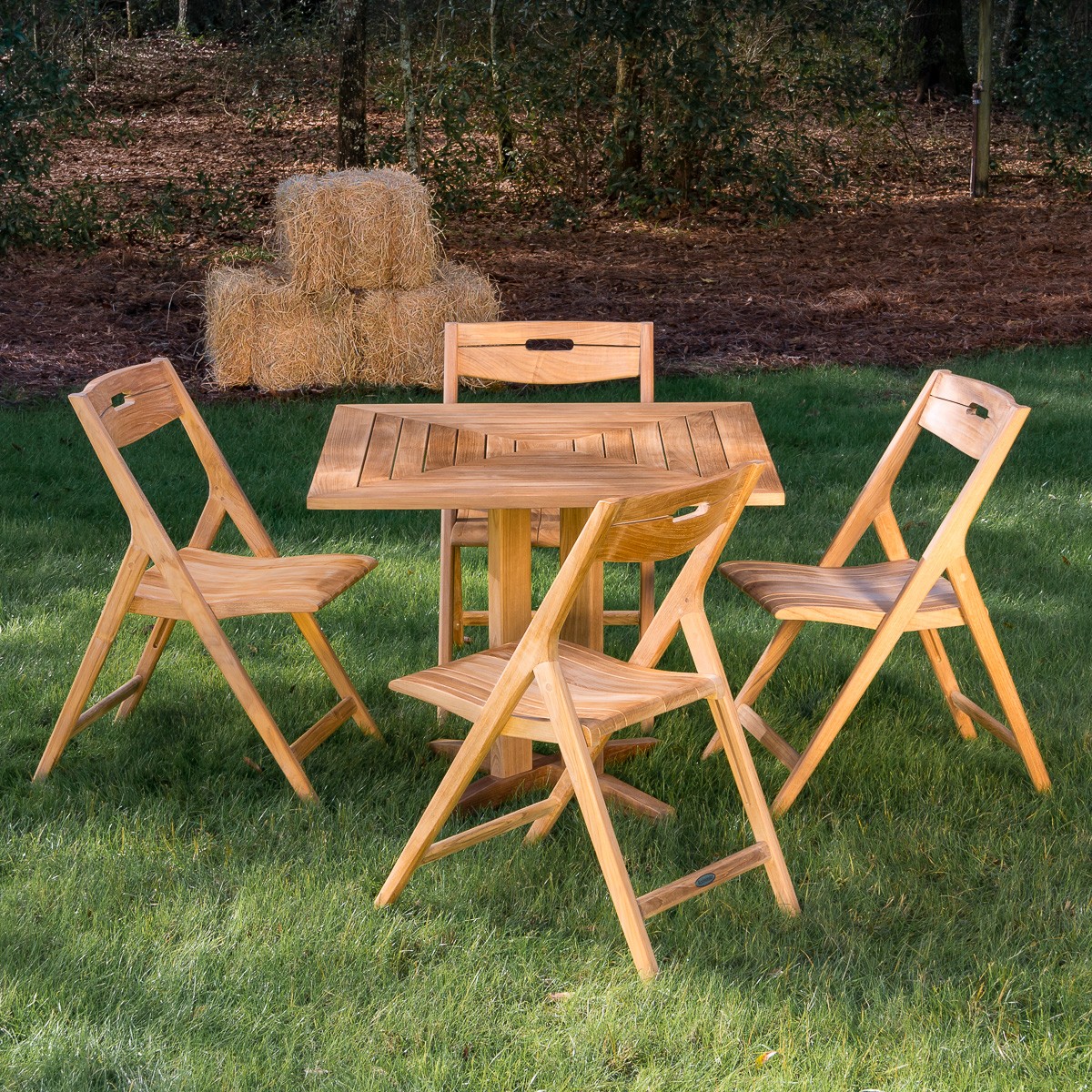 "5pc Square Teak Dining Set comes complete with 4 Folding Surf Chairs and one Pyramid Square Premium teak table. Lifetime Warranty. Built with Grade A Teak harvested from sustainable plantations in Indonesia."  Read more