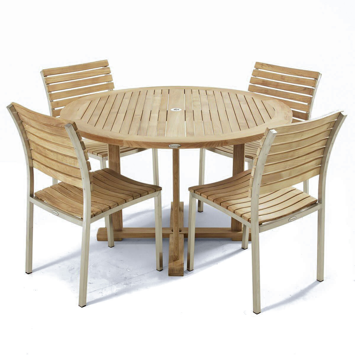 "Classic yet elegant. Features (1) 4ft Round Dining Table and (4) Vogue Side Chairs. Chairs stack four high. Built with 100% Premium Teak harvested from sustainable plantations in Indonesia, and marine grade stainless steel."  Read more