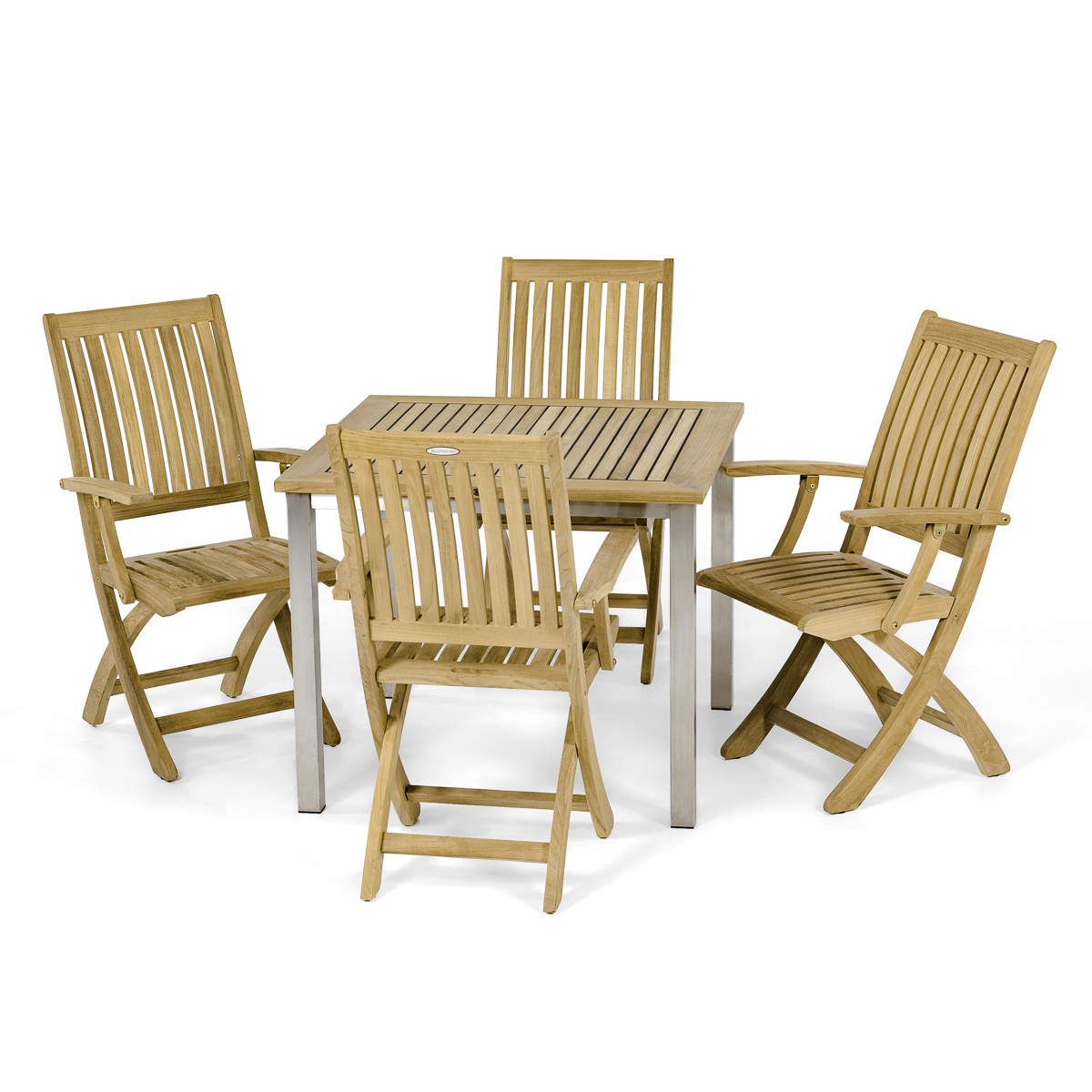 "Combines both traditional and contemporary elements. Includes 1 Vogue 36"" square wooden stainless steel table and 4 Barbuda Folding dining chairs. Crafted with SVLK Certified Grade A Teak harvested from sustainable plantations in Indonesia and...  Read more