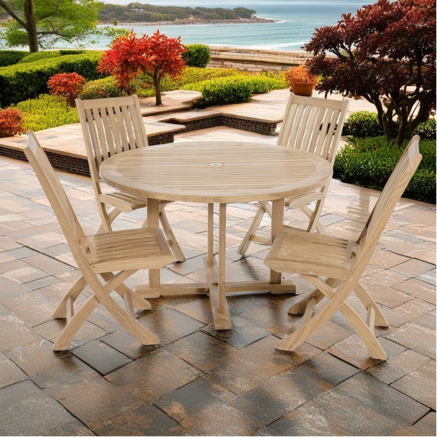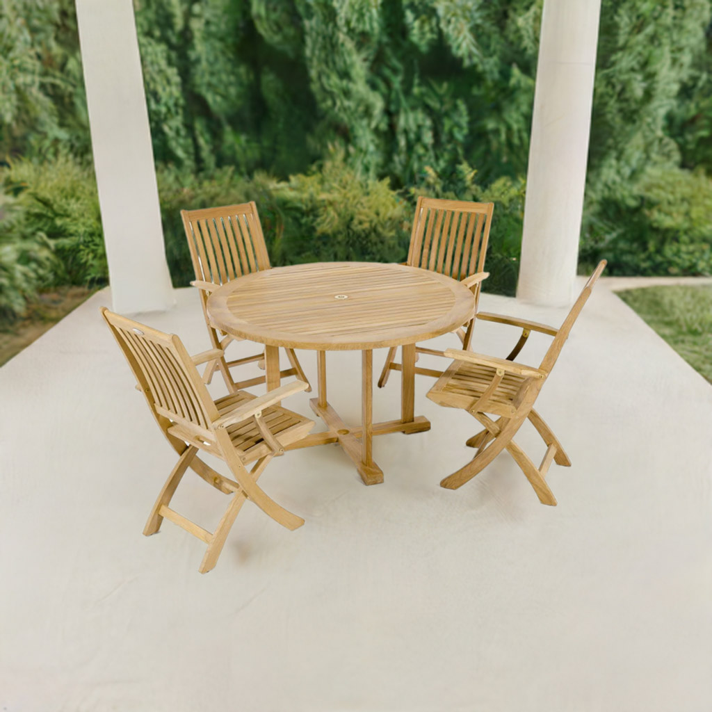 "Classic yet elegant. Features 1 4FT Round Dining Table and 4 Barbuda Folding Side Chairs. Built with 100% Grade A Teak harvested from sustainable plantations in Indonesia."  Read more