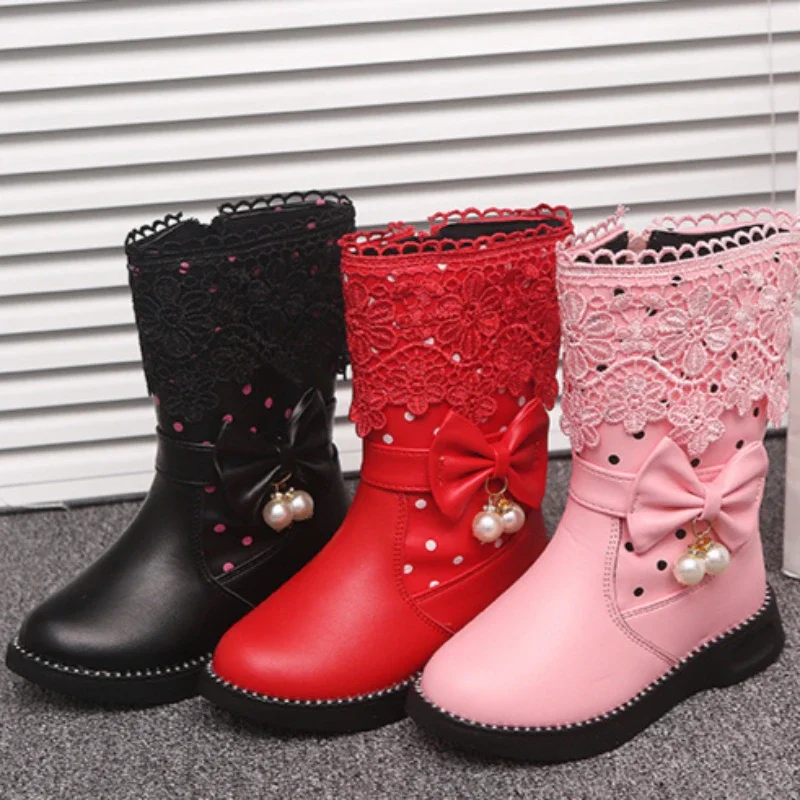 Girls Princess Boots Plus Cotton Boots Winter Lace Bow Kid Cotton Shoes 3-18 Years Old Fashion Children's Leather Short Boots