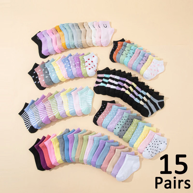 15 Pairs of Youngsters' Short Socks: Candy Colors, Lace Bows, Hearts, Stripes, Soft, Comfortable, Casual, Full Coverage, Student