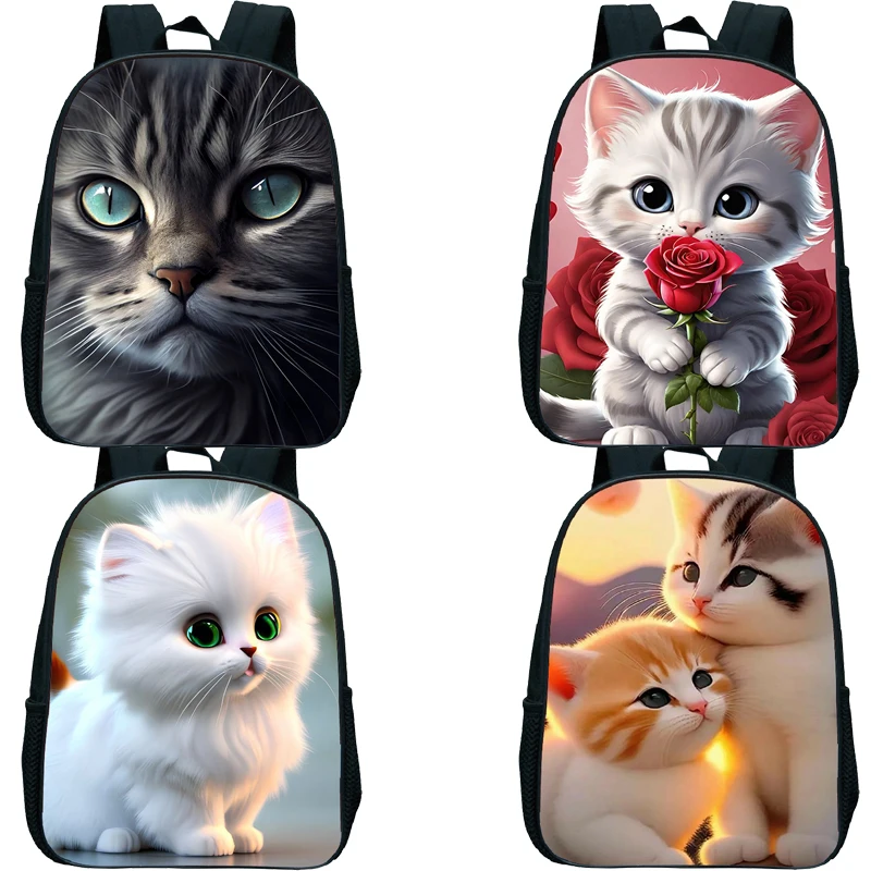 White Cat Printing School Bags Boys Girls Kindergarten Backpack Cute Cat Rucksack 12 Inch Waterproof Bookbag Kids Daily Backpack