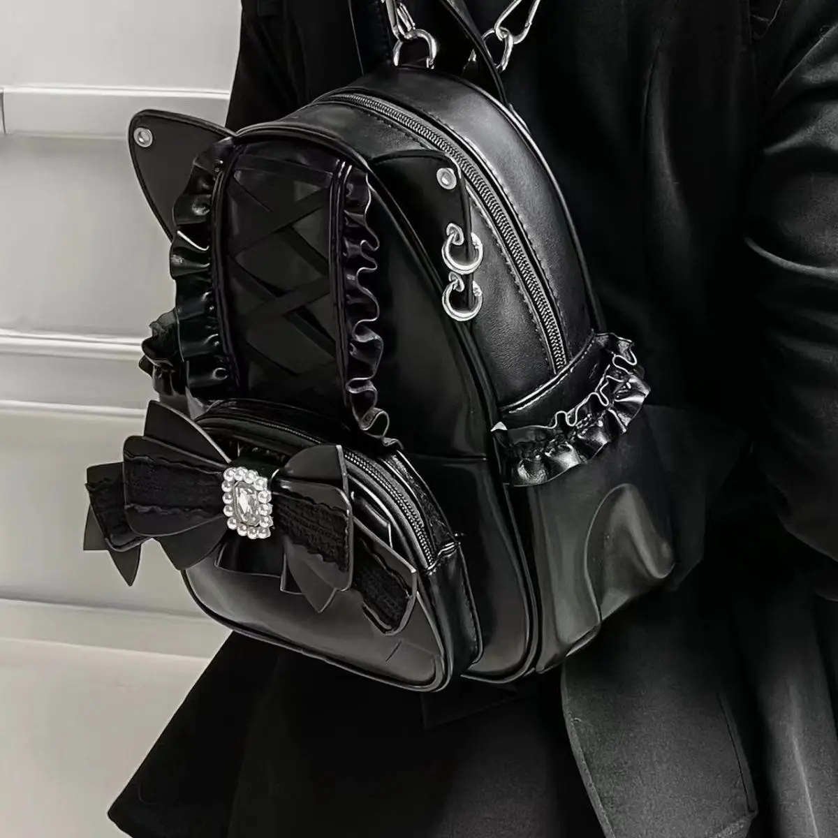 Korean Fashion Y2k Punk Backpack Lace Bow Cat Ear Lotus Lace Decoration Lolita Backbag PU Leather Large Capacity Women Backpack
