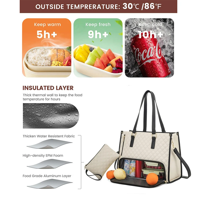 2-in-1 Insulated Leak-Proof Lunch Bag with Cooler Bag & 15.6-inch Laptop Tote Bag Waterproof PU Women's Office Tote Bag Handbag
