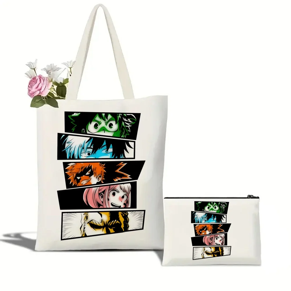 2pcs My Hero Academia Print Tote Bag Set, Lightweight Burlap Shopping Bag, Portable Travel Beach Bag with Makeup Bag