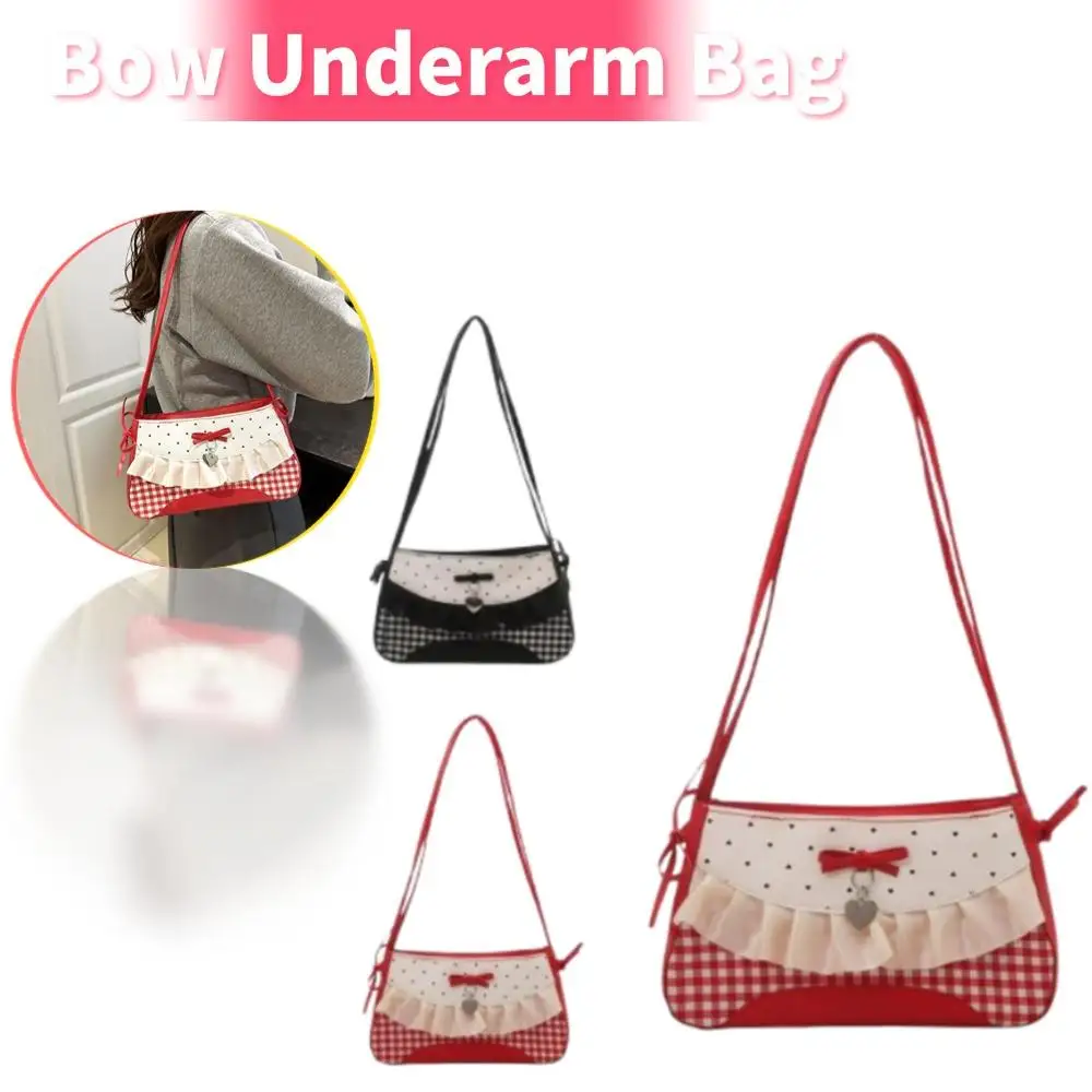 Sweet French Stick Handbag Black Contrast Color Plaid Bow Shoulder Bag Denim Blue Korean Style Cloth Underarm Bags Women