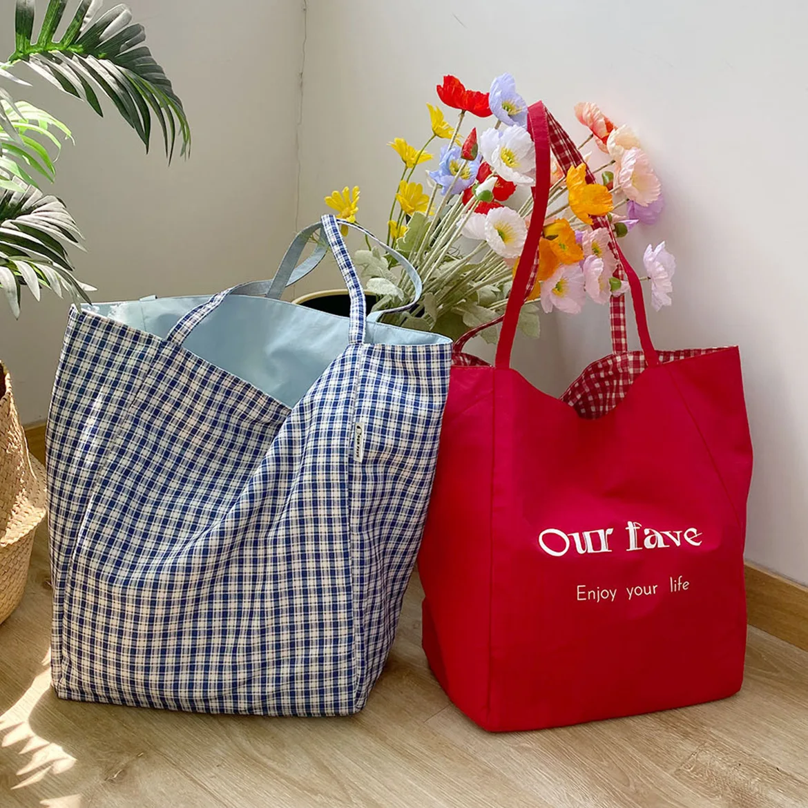 Summer Double-sided Plaid Shoulder Bag for Women Nylon Large Capacity Female Commuter Tote Handbags Travel Cloth Shopping Bag