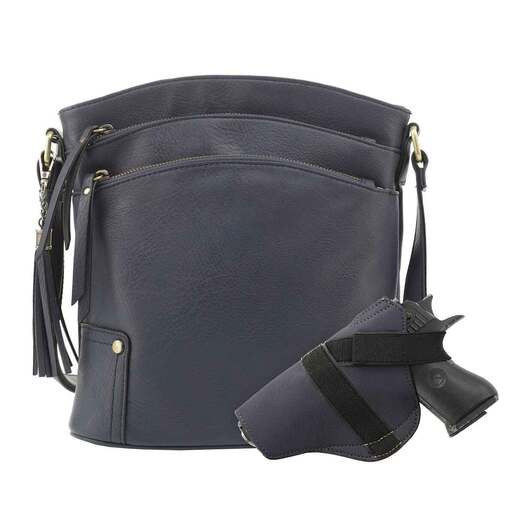 Jessie & James Robin Concealed Carry Lock and Key Crossbody - Navy Made with faux leather Tassel zipper detail Triple zip compartment (1 main zippered pocket, with 2 front pockets) Separately concealed compartment on back with 1-zipper opening Lock...  Read more