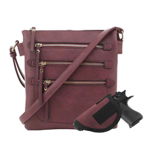 Jessie & James Piper Concealed Carry Lock and Key Crossbody - Wine Made with faux leather Separately concealed compartment on back with 1-zipper opening Lock and Key feature for safe and secure weapon storage Zipper closure with 2 interior...