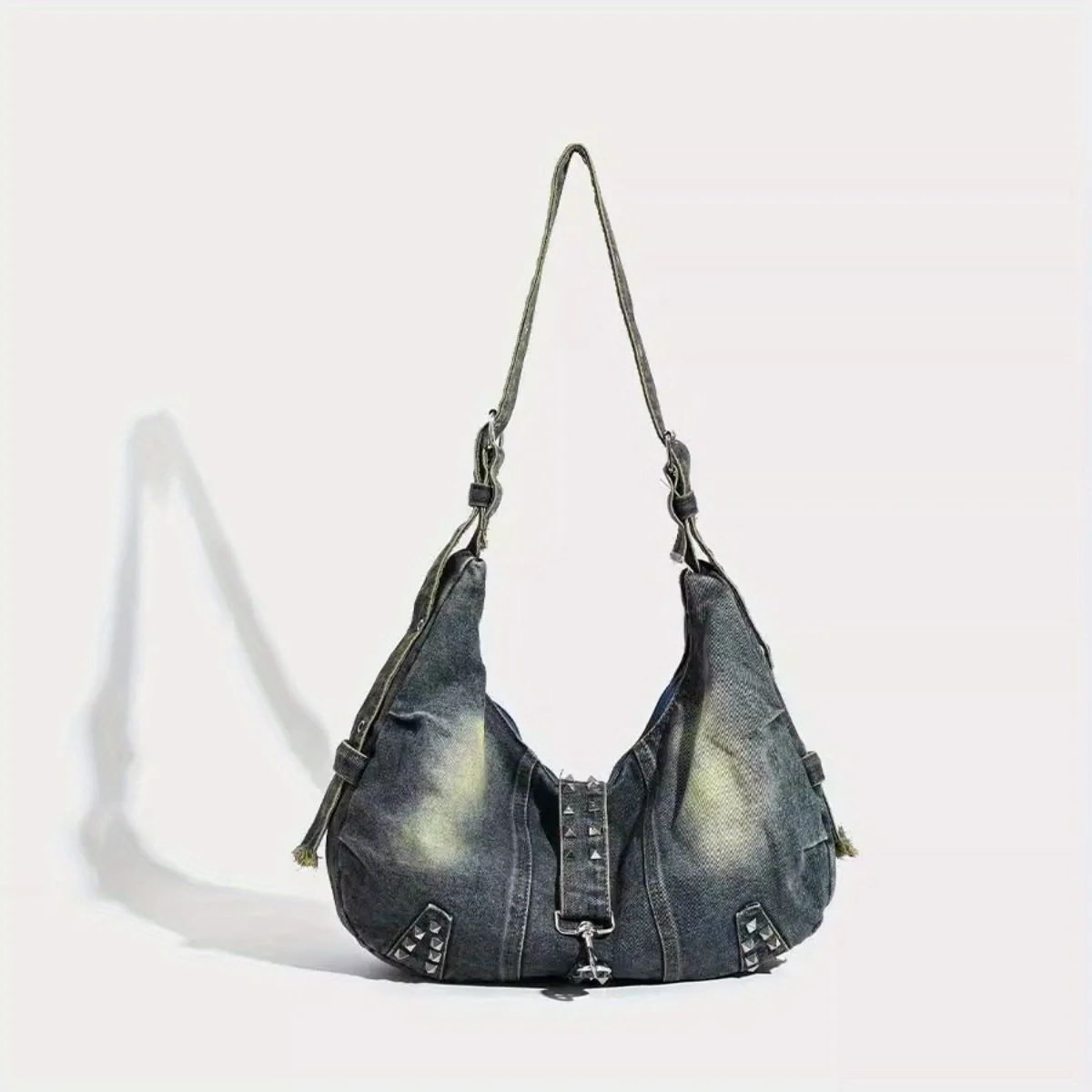 Retro Denim Rivet Handbag Women Wrinkle Distressed Large Capacity Shoulder Bag Ladies Everyday Casual Versatile Crossbody Bags