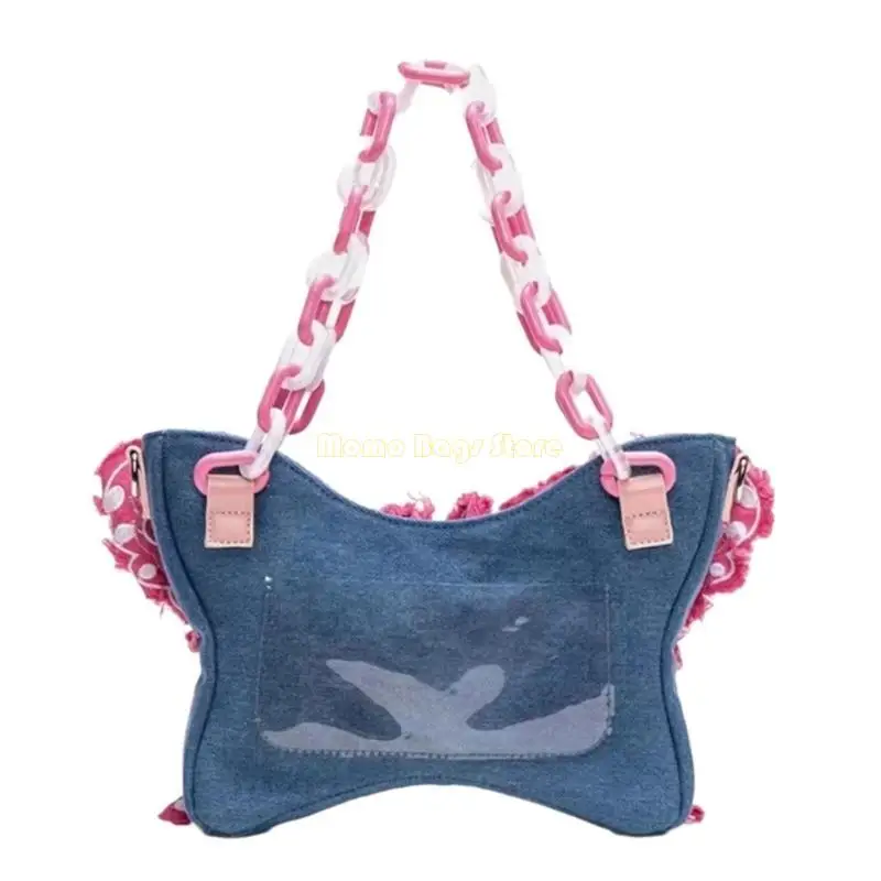 X90D Single Shoulder Bag Acrylic Chain Butterfly Denims Crossbody Underarm Bag Purse