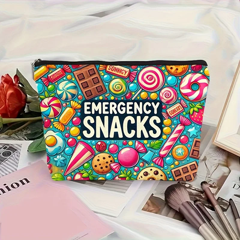 Emergency Snack Collection Linen Cosmetic Bag, Lightweight Cosmetic Pouch with Zipper for Women, Toiletry Travel Bag & Coin Purse