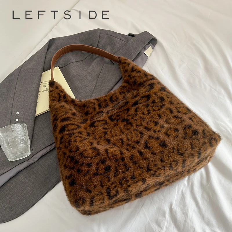 LEFTSIDE Soft Warm Faux Fur Leopard Shoulder Bags for Women 2025 Winter Korean Fashion New Leopard Handbags Trend Hobo Bag