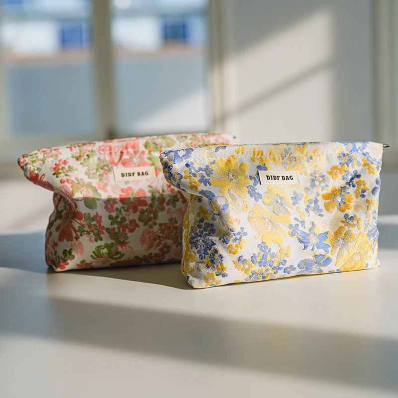 Women's Makeup Bag Pink Flowers Canvas Large Capacity Item Storage Bag Portable Zipper Design Clutch Bag Travel Toiletry Bag Ins