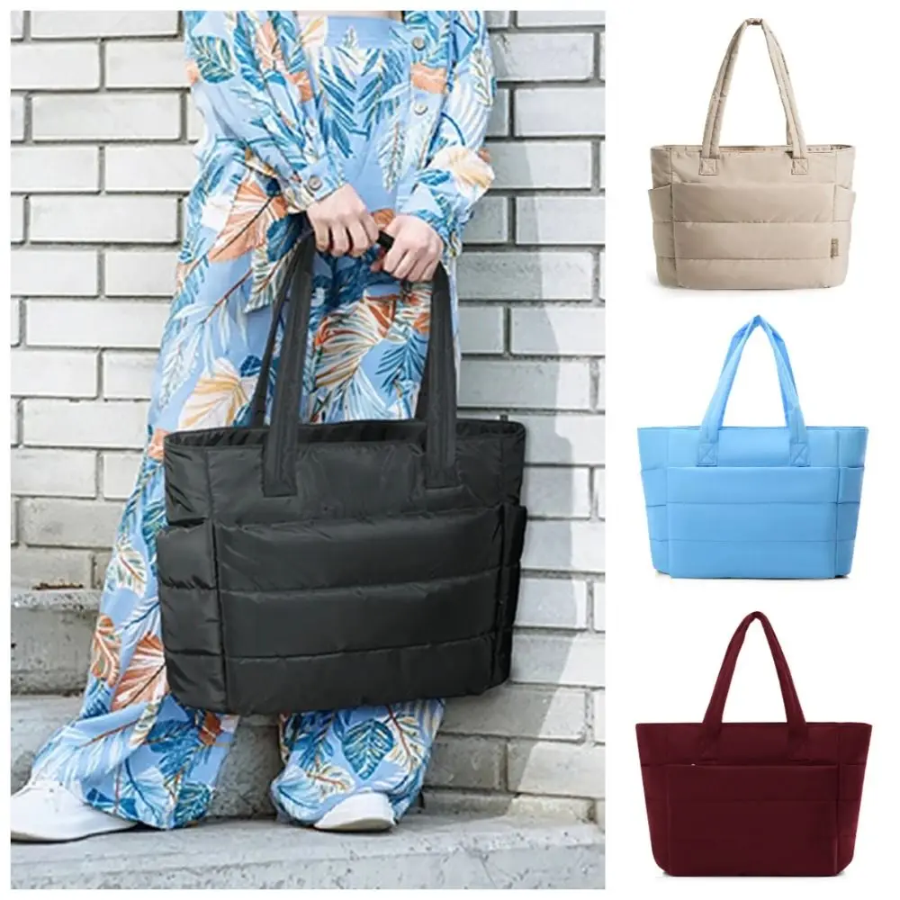 Versatile Large Capacity Cotton Padded Tote Bag Soft Lightweight Quilted Tote Bag Waterproof Zipper Commute Briefcase Girls