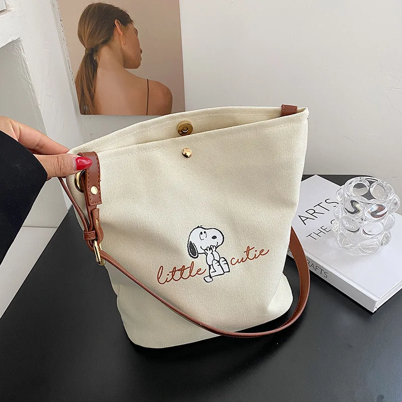 2025 New Snoopy Bucket Bag Simple Shoulder Bag Puppy Tie Pocket Canvas Bag Daily Travel Handbag Bag