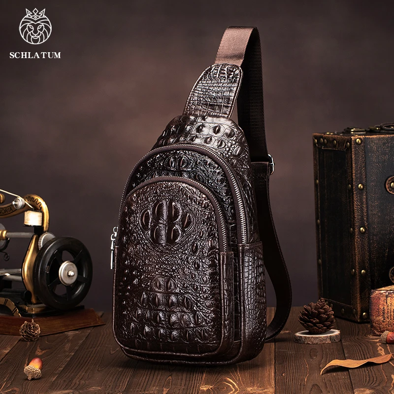 SCHLATUM men's Genuine Leather vintage Crocodile Pattern Chest Bag luxury men crossbody Travel bag multifunction sling bags