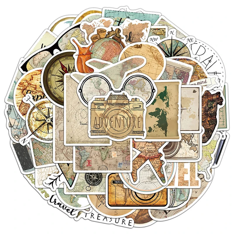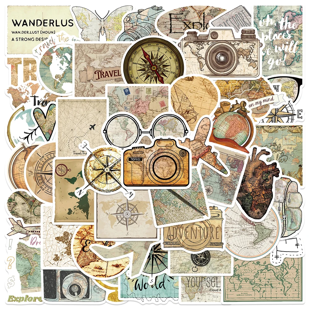 50pcs Retro Aesthetic Travel Map Tourist Stickers For Luggage Laptop Guitar Phone Bicycle Car Waterproof Graffiti Vinyl Decals