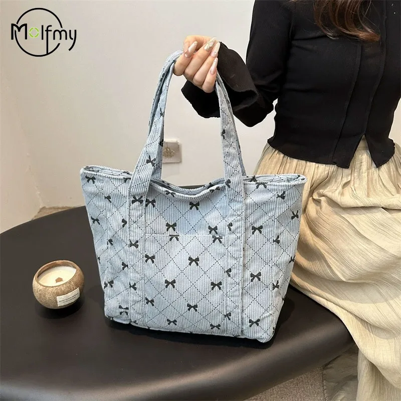Corduroy Tote Bag Bow Pattern Shoulder Bag Large Capacity Fashion Underarm Commuting Handbags Shopping Bags Eco-friendly Handbag