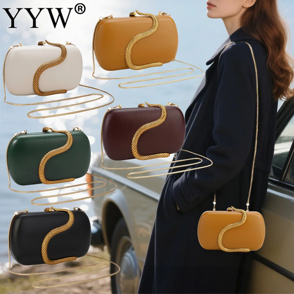 Women Glamorous Luxury Snake Hardware Decoration Pu Leather Clutch Long Chain Box Shaped Handbag Evening Bag Versatile Purse