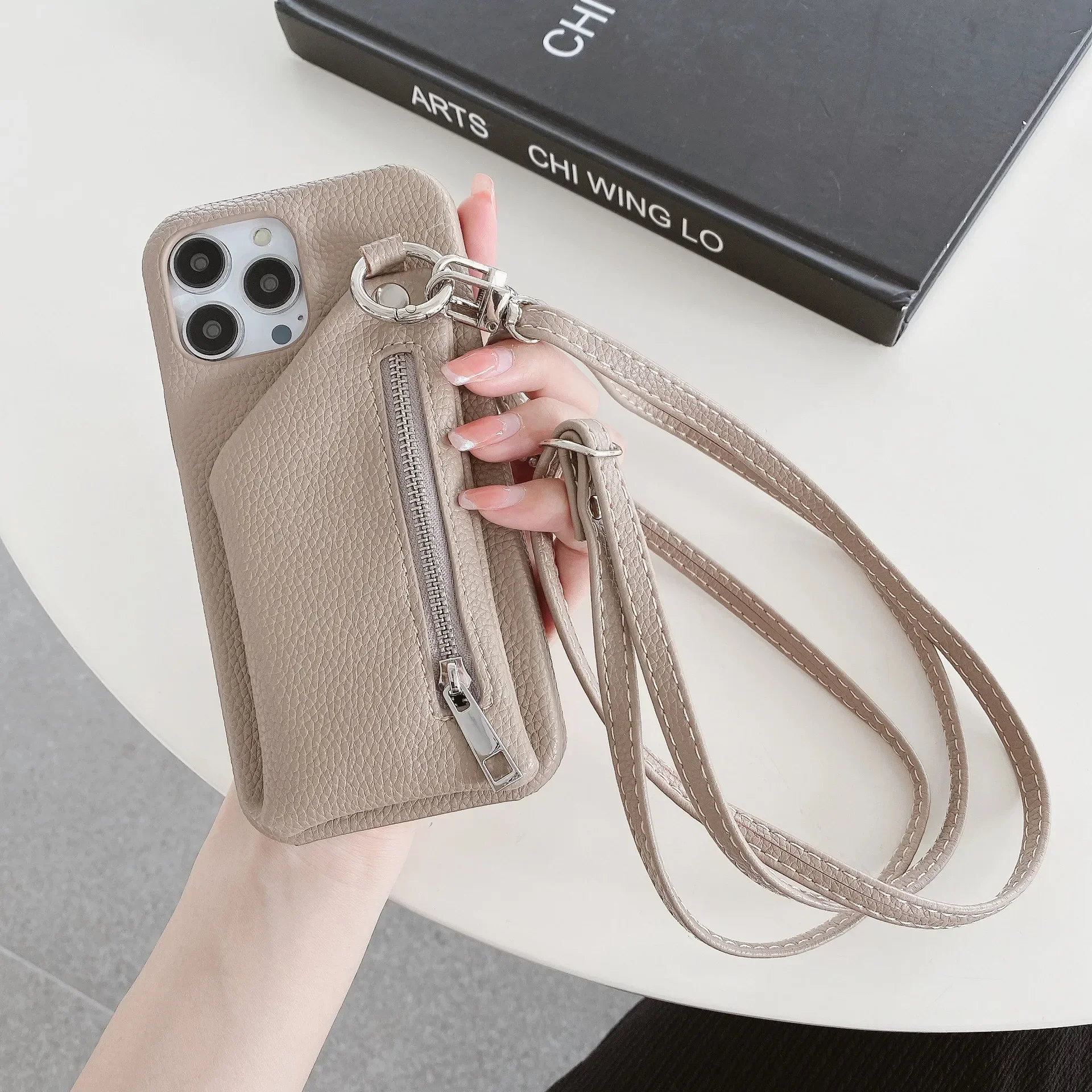 Zipper Wallet Crossbody Lanyard Phone Case For iPhone 16 Plus 15 14 Pro Max 13 12 11 XS XR Card Pocket Coin Purse Leather Cover