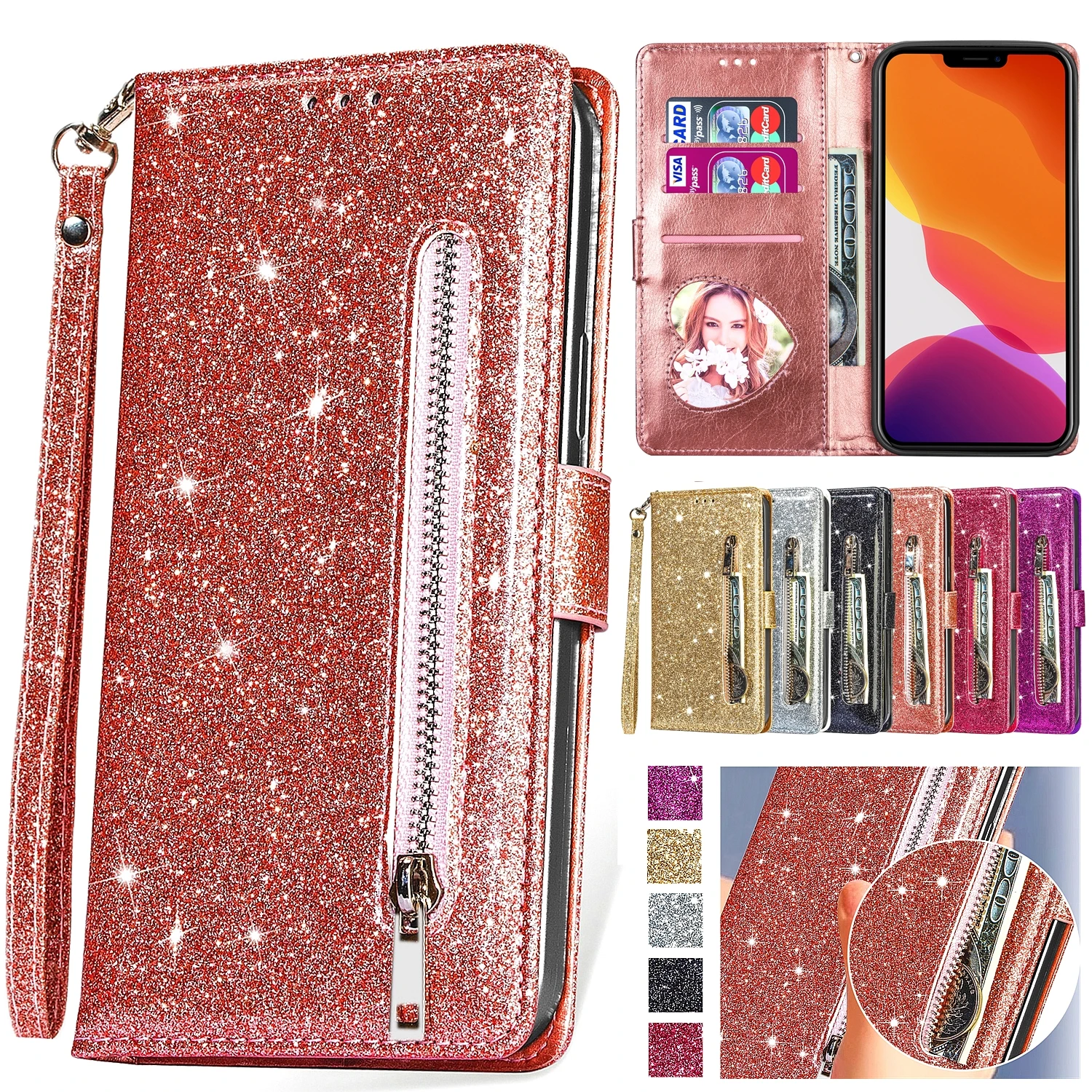 Zipper Flip Wallet Glitter Leather Case for iPhone 16 15 14 13 12 11 Pro Max XS XR 8 7 Plus SE 16E Mini Bling Stand Phone Cover