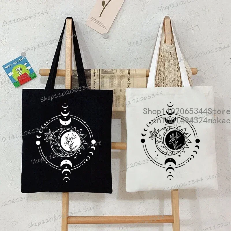 Vintage Moon and Sun Print Women Shoulder Bag Funny Fashion Sun Moon Flower Butterfly Pattern Shopping Bag Ladies Canvas Handbag