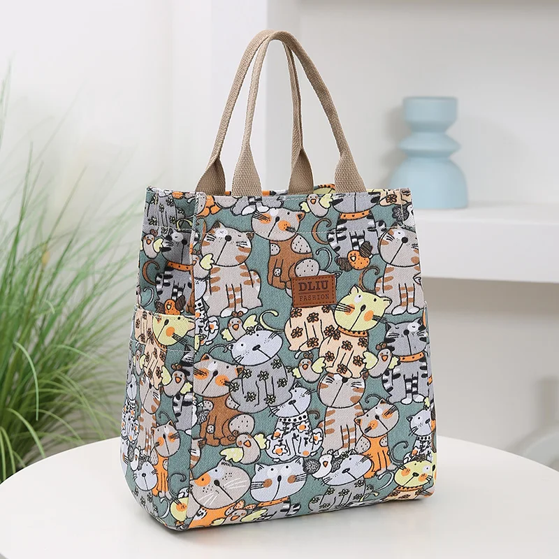 Cute Cartoon Print Lunch Bag, Portable Canvas Bento Bag, Women's Casual Handbag & Tote Purse For School, Office, Picnic