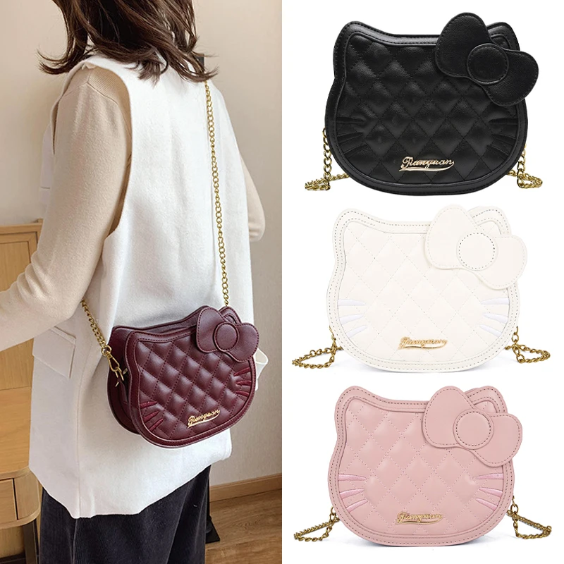 Hello Kitty Crossbody Bag Cartoon Bow Tie Rhombus Grid Women Shoulder Bag Chain PU Leather Casual Simple Messenger Bags Handbag