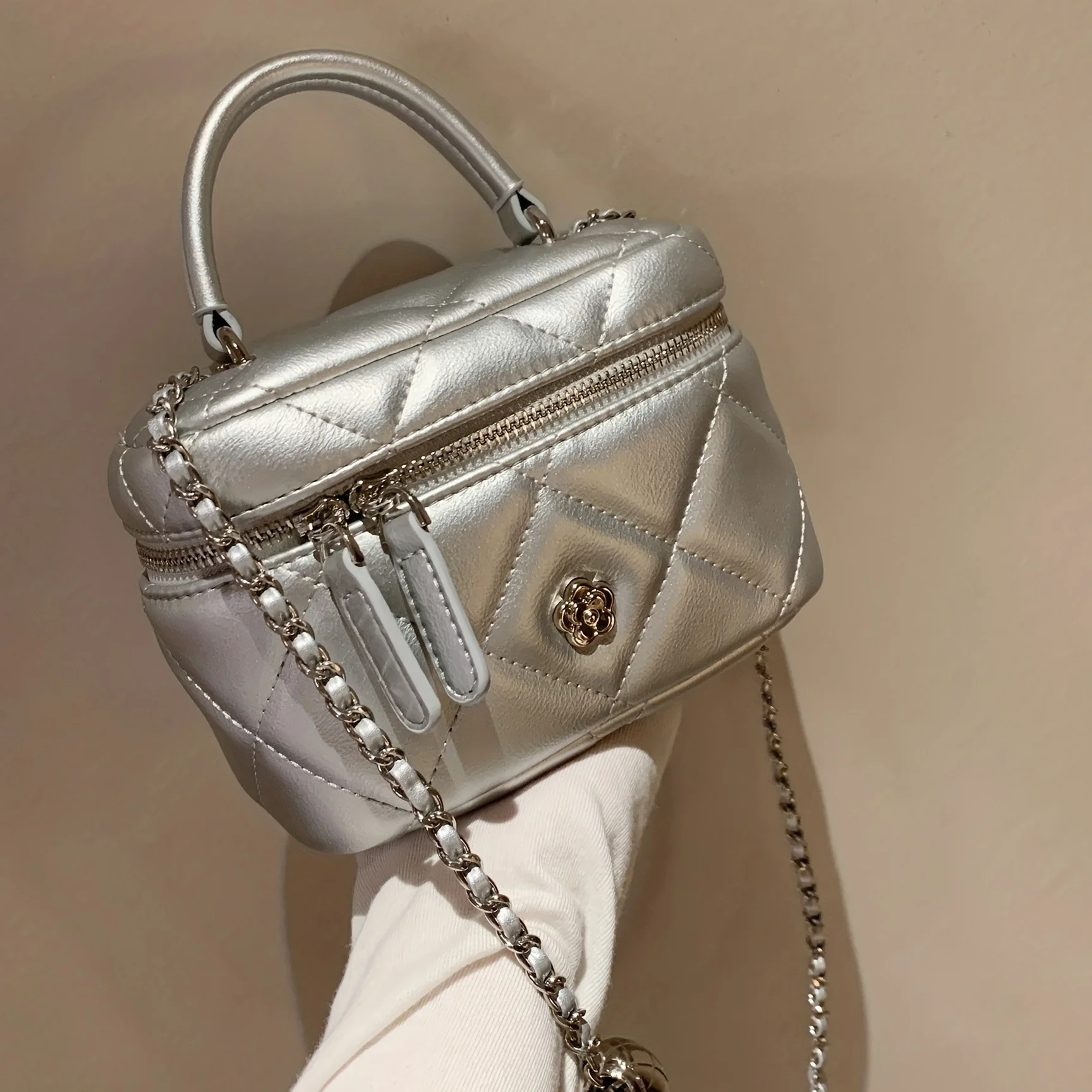 Mini Quilted Metal Chain Crossbody Satchel Bag, PU Leather Textured Bucket Bag, Classic Versatile Fashion Shoulder Bag