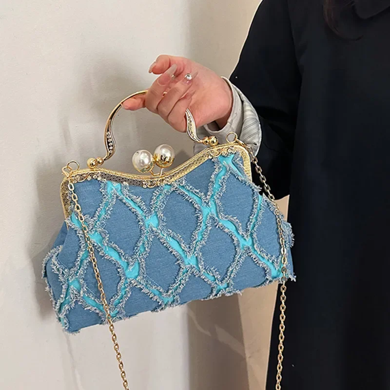 New Vintage Denim Light-Blue Bag Metal Handle Chain Clutch Antique Kiss Lock Shoulder Crossbody Bag Kiss Lock Frame Evening Bag