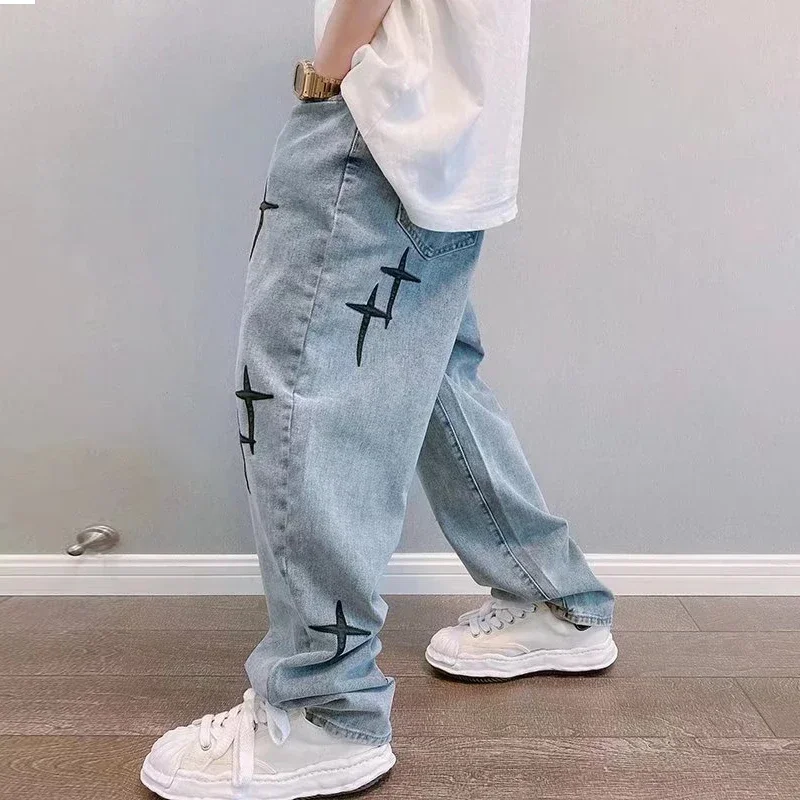 Men Cross Star Appliqué Embroidery Comfortable Jeans Male High Street Loose Straight Denim Pants Versatile Minimalist Trousers