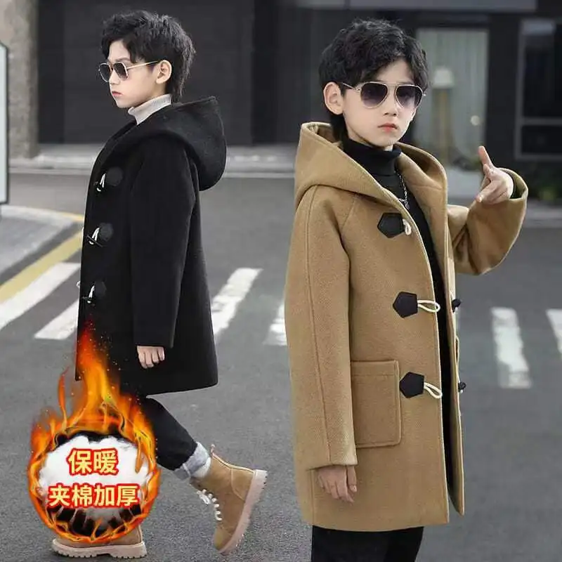 2023 New Boy Wool Coat Winter Fashion Hooded Jacket Solid Single-Breasted Plus Cotton Warm Outerwear Children High Quality Parka