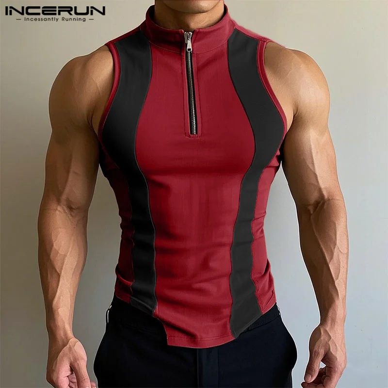 INCERUN Tops 2025 American Style Fashion Men's Spliced Contrast Zipper Design Vests Summer Streetwear Casual Hot Sale Tank Tops
