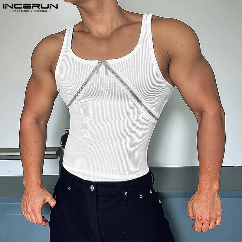 INCERUN Tops 2025 American Style Men Texture Symmetrical Double Zipper Design Vests Casual Streetwear Solid Sleeveless Tank Tops