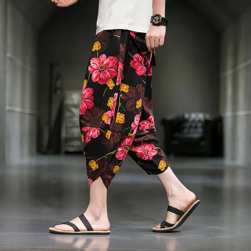 2025 Summer Harajuku Casual Calf Length Pants Mens Pants Wide Leg Cotton Linen Printing Harem Pants Men Clothing Fashion Baggy