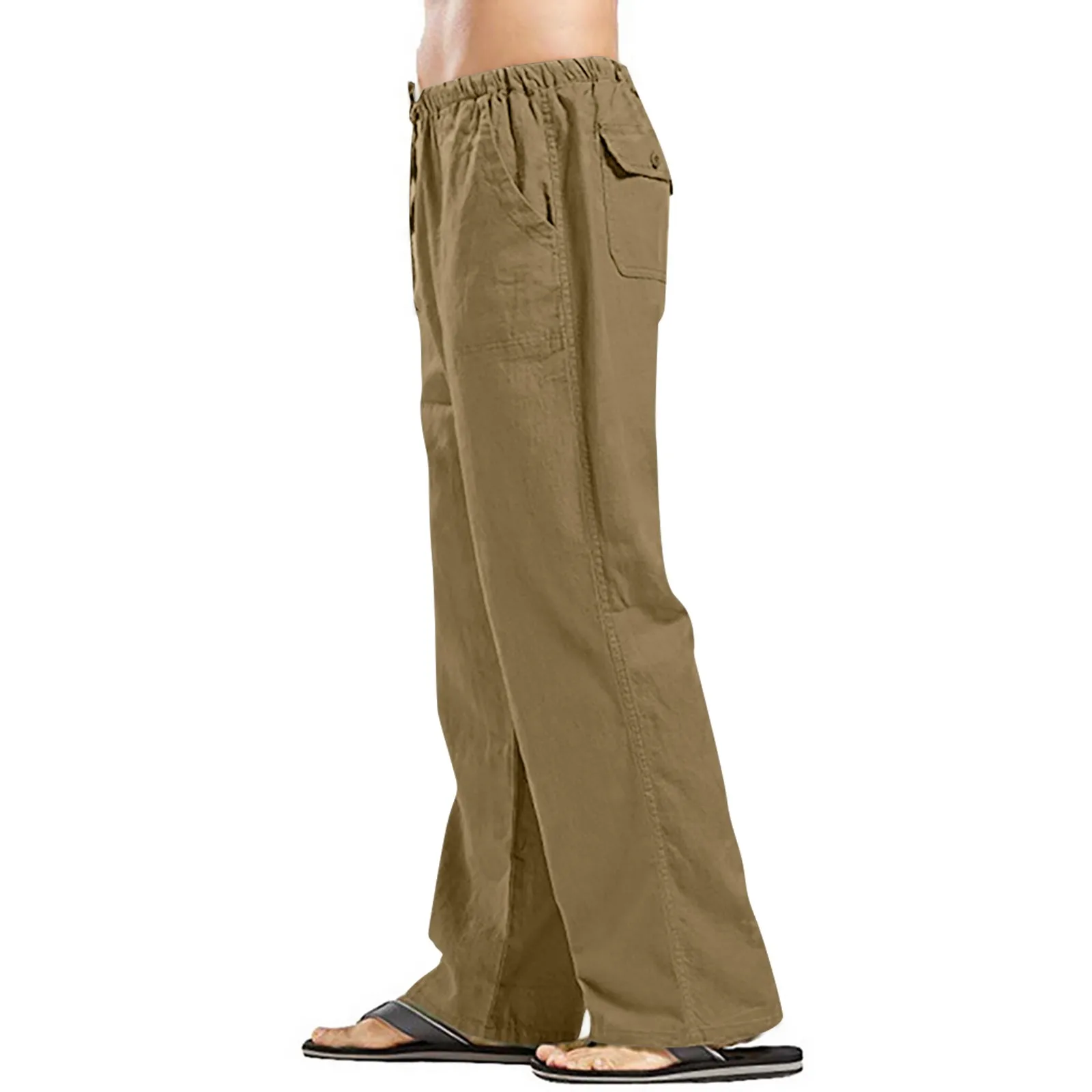 Men's Cotton Linen Solid Color Wide Leg Breathable Long Pants Casual Lightweight Loose Versatile Fashionable Straight Trousers