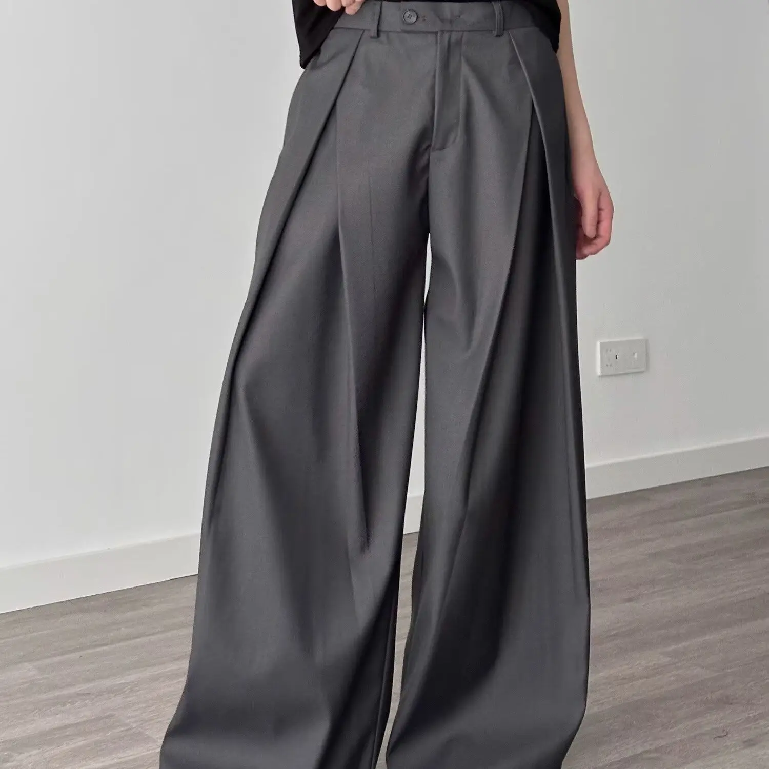 Korean Style Men's Suit Pants Solid Color Pleated Design Wide Leg Menswear Straight-leg Male Bottom Summer