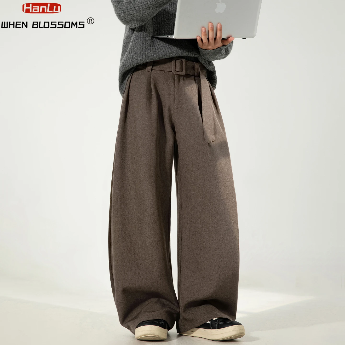 HANGLU 2025 Men's 3D Pleated Trousers J-Cut Drape Wide Leg Old Money Style Belted Formal Casual Slim Fit Pants