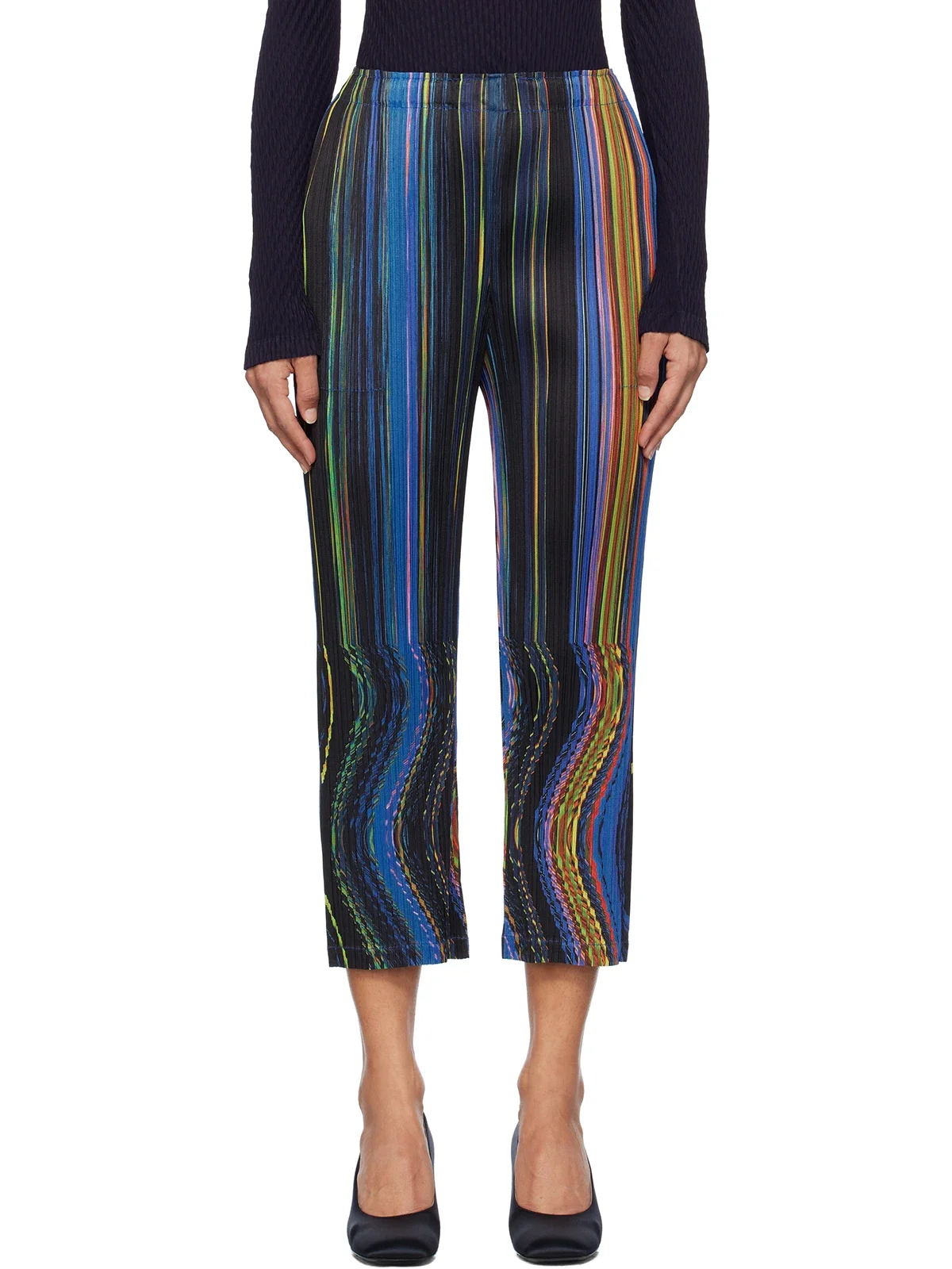 MIA Miyake Pleated Multicolor Warp Trousers Stripes Printed Wide-leg Elasticized Waistband Pants Garment-pleated Tricot Trousers