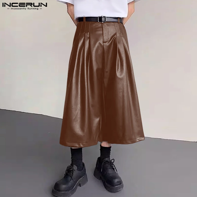 INCERUN Men Wide Leg Pants Solid Button Joggers Pleated Trousers Men PU Leather Fashion Casual Calf-length Pants 2025 Streetwear